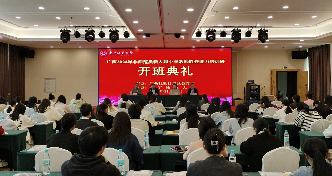 为贯彻全国、全区教育大会精神,弘扬教育家精神,提升我区中小学教师专业素养和教学能力,培养一支高素质专业化教师队伍,教育厅举办2024年非师范类新入职教师胜任能力培训班,11月23日, “广西2024年非师范类新入职中学教师胜任能力培训班”在南宁师范大学隆重开班。