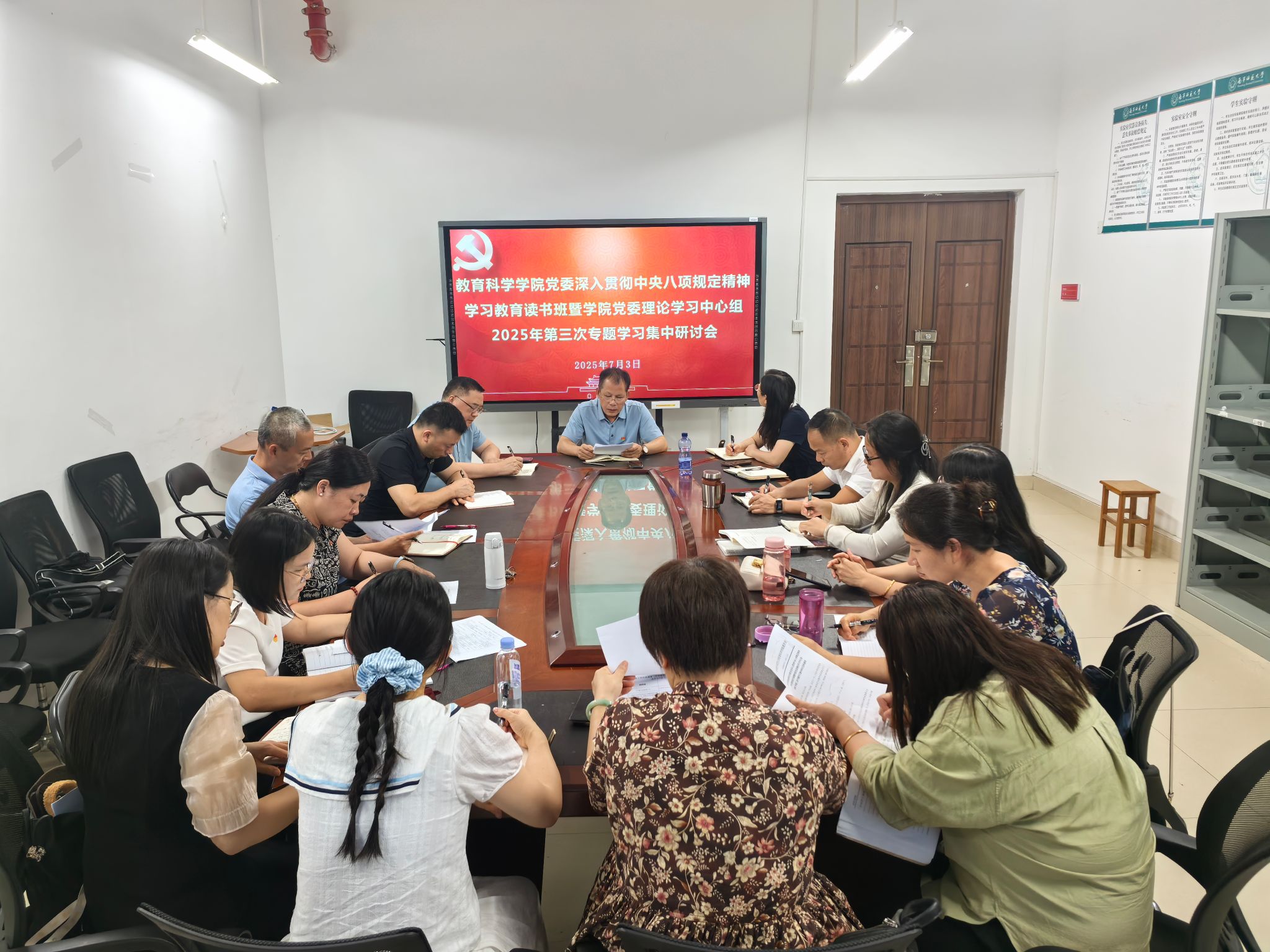 党委在五合校区理综楼1004-1会议室召开深入贯彻中央八项规定精神学习教育读书班暨学院党委理论学习中心组2025年第三次专题学习集中研讨会。学院党委书记余朝文主持会议,学院党委理论学习中心组成员参加会议,学院纪委委员、各支部书记列席会议。
