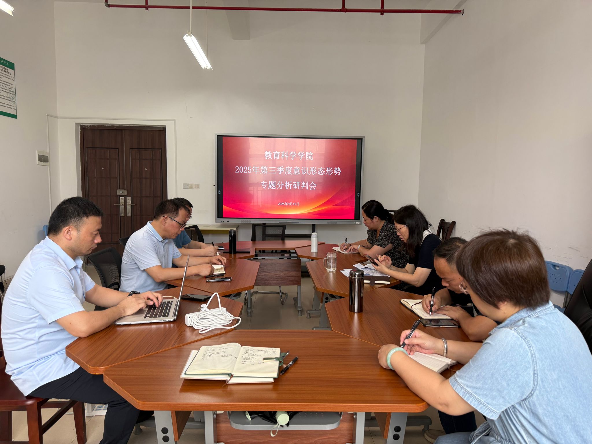 于理综楼1004-2会议室召开学院第三季度意识形态形势专题分析研判会。学院班子成员、院长助理、学院纪委委员、学院党委组织员、团委书记等参加会议,本次会议由学院党委书记余朝文主持,会议对秋季新学期意识形态工作进行深入研讨与系统部署。