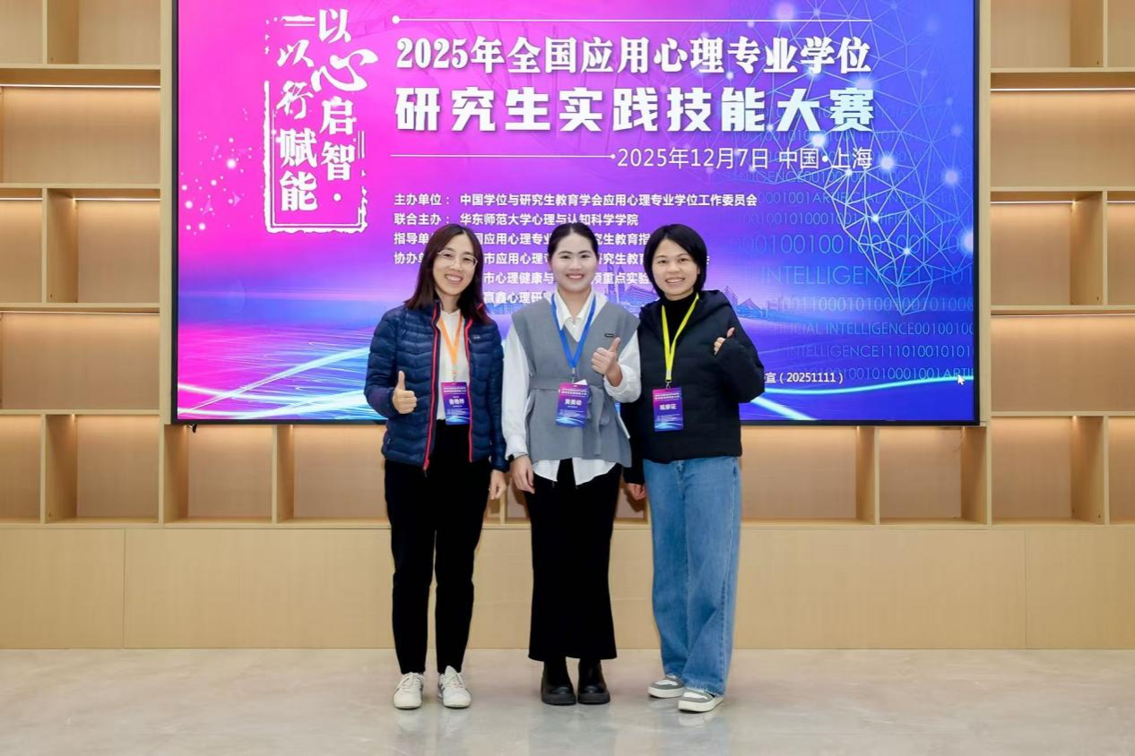 2025级应用心理专业黄美幼同学荣获心理咨询面谈技能比赛二等奖;2024级应用心理专业王雯萱和韦秋萍同学荣获应用心理案例开发比赛三等奖,2024级应用心理专业硕王琪琪、白心怡和熊敏同学荣获心理科普作品创作比赛三等奖。